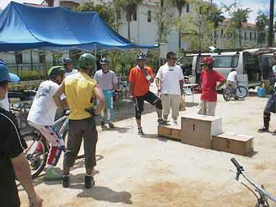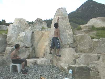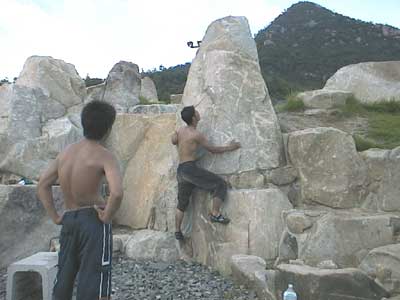 | 戻る | ![]() 開会式 呉ポートピアパークの秋岡さんの挨拶 ![]() 国際エリート宮岡啓太選手の挨拶 世界選手権も頑張ってネ! ![]() 午後の部スタートセレモニー ハード&スーパークラスの出場選手紹介 ![]() 午後の部を中断してミーティング (選手とオブザーバーの体力を考えて2ラップに変更) ![]() 大会終了後に現われた謎のフリークライマー約2名 ルートを思案するクラッシャー&見守るKEITA ![]() 飛びつくKEITAとコーチ役のクラッシャー (KEITAの手足には擦り傷が・・・) |
