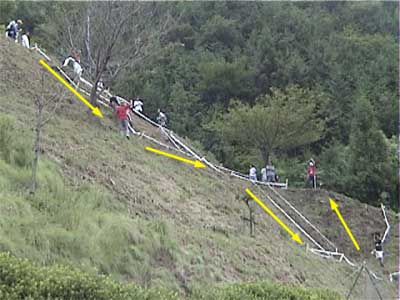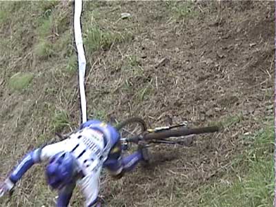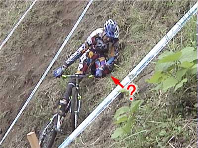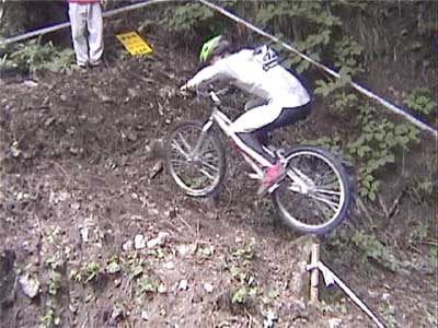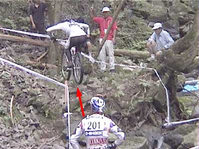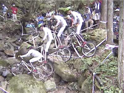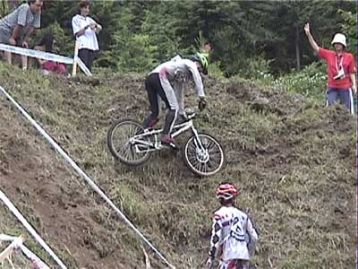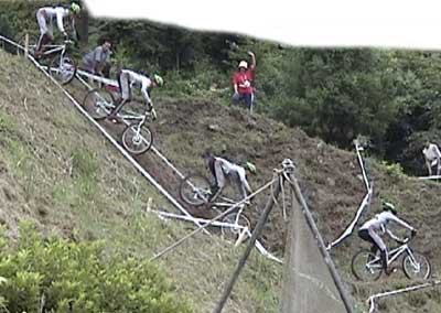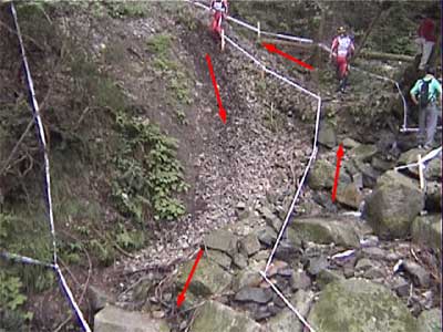 | 戻る | ![]() 一番奥の沢に設定された3セクション 大岩の散在した沢を上り、ガレ場の急斜面を下りてさらに上がってアウト ![]() 一番乗れていたように見えたチェリー・クリンケンベルグ ガレ場を降りるまでクリーンペースも、最後の登りで無念の5点 ![]() 脅威のジャンプを見せるブルーノ・アーノルド (音もたてずに軽く飛ぶ) ![]() ダイナミックな飛び降りもスムーズ&サイレント 0108bruno01.wmv (1.07MB) ![]() 多くの選手が手こずった沢側面の登りもスムーズにクリア (それを見上げるオット・ピの後ろ姿が印象的) 0108otpi01.wmv (479KB) ![]() もう少しでアウトだったのだが・・・あと数10cmのところでタイムOVER (結局1ラップ目は全員が5点) ![]() 激斜面下りの5セクション(エリート8セクションと同一) 最後の登りがまたエゲツナイ・・・ ![]() 素直に走って下ったブルーノ・アーノルド (多くの選手は横向きにペダルを着けながら降りた) 0108bruno02.wmv (555KB) ![]() 同じように下ったオット・ピだったが、制動しきれずに足着き1点 0108otpi02.wmv (355KB) ![]() 日本のエースも無念の転倒 0108hasep.wmv (344KB) ![]() 激斜面登りでもペダルを極力使わないブルーノ (結局は転倒して5点だった) ![]() 帝王オットピの苦難の表情 (うーん、コレって1点減点でいいのかなぁ) |